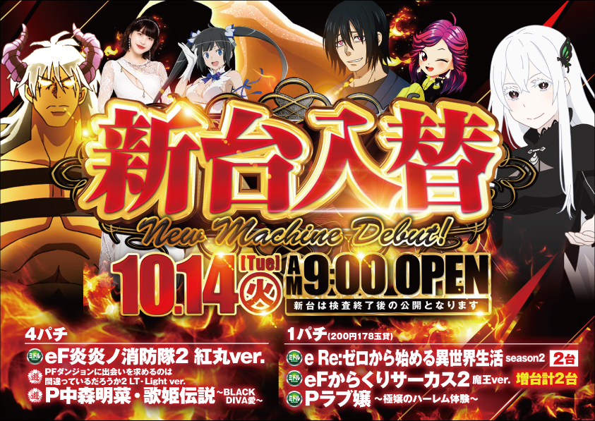 2025年10月14日~新台情報 2025年10月10日 新台情報 スーパーパオアイゼン 2025年10月14日(火)新台入替 店舗情報を見る 瓦町店 2025年10月14日(火)新台入替 店舗情報を見る