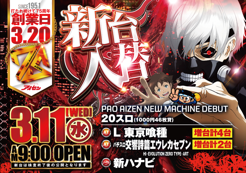 2026年3月10日~新台情報 2026年03月06日 新台情報 アトランティスアイゼン 2026年3月10日(火)新台入替 店舗情報を見る スーパーパオアイゼン 2026年3月11日(水)新台入替 店舗情報を見る